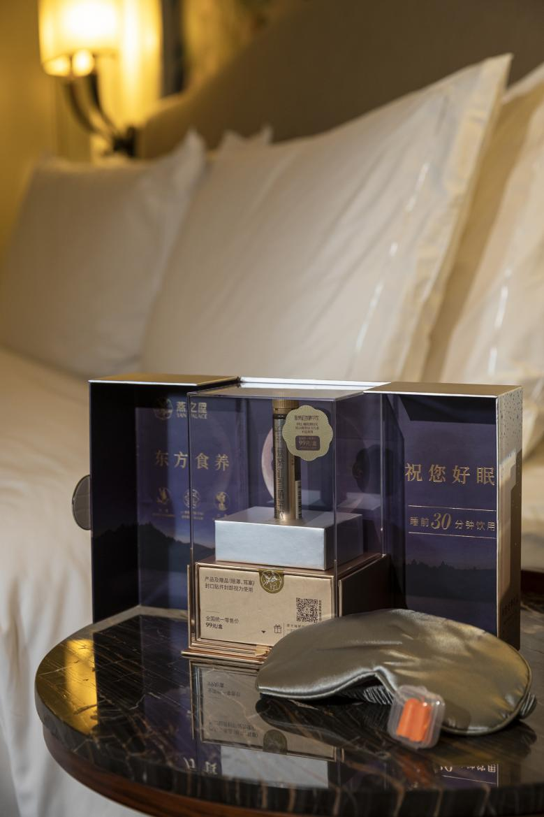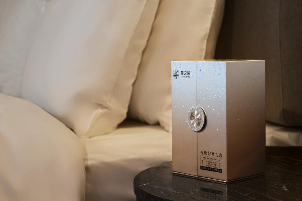 更加貼心的是,燕之屋·燕窩紅參精華飲(祝您好夢(mèng)禮盒)在包裝上亦煞費(fèi)苦心。燕之屋·燕窩紅參精華飲(祝您好夢(mèng)禮盒)外包裝以金屬光澤的漸變香檳金為基調(diào),以繁星、女神為元素,中心搭配燙金logo設(shè)計(jì),有一種渾然天成的靜謐;內(nèi)里則由深邃的星空、靜謐的湖水、溫柔月光下的女神融合而成,水天一色的景象恍若夢(mèng)境。打開禮盒,燕之屋·燕窩紅參精華飲、遮光眼罩、輕巧耳塞躍然而出,仿佛在敦促投宿者漸入夢(mèng)境。旅途奔波后下榻海悅山莊,臨睡之際,不妨放緩步調(diào),飲一支燕窩紅參精華飲,戴上眼罩和耳塞,用一盒安睡組合,沉淀身心,安享五星級(jí)睡眠之旅。